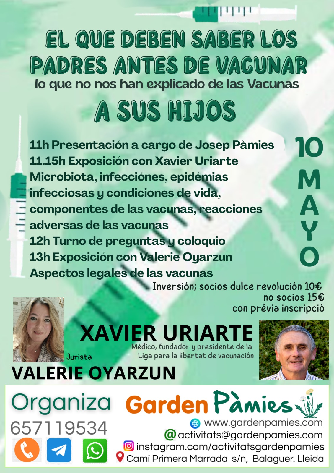- 11.15h: Exposición con Xavier Uriarte, médico, fundador y presidente de la Liga para la libertad de vacunación, quien abordará temas como microbiota, infecciones, epidemias infecciosas y condiciones de vida, componentes de las vacunas y reacciones adversas.