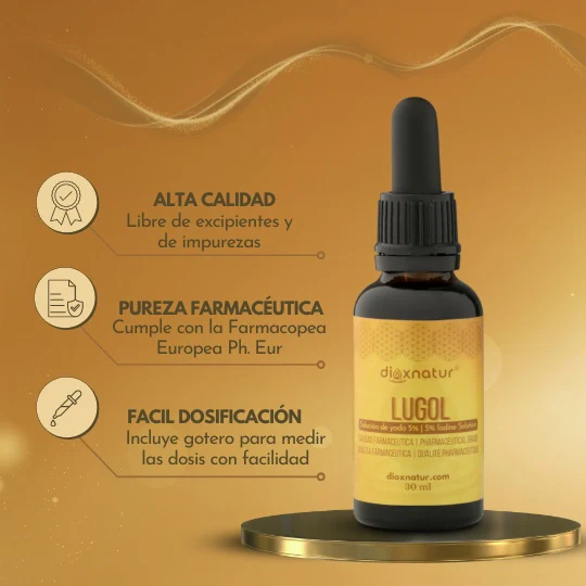 La solución de Lugol al 5 % es un preparado concentrado que combina yodo elemental (I₂) y yoduro de potasio (KI) en agua doblemente destilada, formulado para ofrecer una dosis elevada de yodo biodisponible. Se presenta en frasco oscuro y cuenta con un cuentagotas o pipeta que permite dosificar cada gota con precisión.